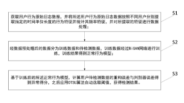 本发明公开了一种基于BiGAN与OTSU的内部用户行为检测方法,包括如下步骤:获取用户行为原始日志数据,并将所述用户行为原始日志数据按照不同用户分别提取指定的时间单位长度计算其频率特征,并对所提取的特征进行数据处理;基于数据处理后的特征,利用BiGAN网络作为构建用户正常行为模式的模型,获得正常行为模型,并训练所述正常行为模型;基于训练后的所述正常行为模型,计算用户待检测数据的重构误差与判别器误差得到异常得分,之后应用OTSU算法自动选取阈值,获得检测结果。以此提高异常检测方法在内部用户行为检测中的准确率,并降低误报率。