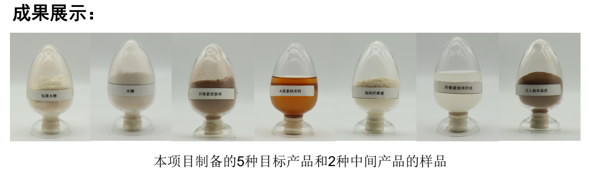 项目的设计科学,采用自主研发的“酸热-共熔-均质”生物炼制技术和“分段-闭合-循环”的制备工艺,将荻苇生物质分别制备成低聚木糖和木糖 2 种生物基功能糖、纤维素纳米丝和木质素纳米粒 2 种生物基纳米材料、种无土栽培基质等 5 种目标产品,以及纤维素前驱体和高纯纤维素 2 种中间产品。