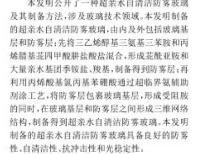本发明公开了一种超亲水自清洁防雾玻璃及其制备方法,涉及玻璃技术领域。本发明制备的超亲水自清洁防雾玻璃,由内及外包括玻璃基层和防雾层;先将三乙烯醇基三氨基三苯胺和丙烯腈基苝四甲酸肼盐酸盐混合,形成苝酰亚胺和大量亲水基团季铵盐、羧基,制备得到防雾层;再利用丙烯酸基氯丙基苯硼酸通过超临界氨辅助刮涂工艺,将防雾层包裹玻璃基层,形成受阻胺的同时,在玻璃基层和防雾层之间形成三维网络结构,制备得到超亲水自清洁防雾玻璃。本发明制备的超亲水自清洁防雾玻璃具备良好的防雾性、自清洁性、抗冲击性和光稳定性。